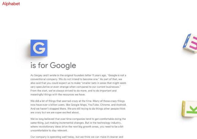 Google se transforma em Alphabet em aposta para dar ênfase a novos negóciosNoel Randewich e Mari Saito (Reuters)11 ago 2015 às 10:59 1 min leitura11 ago 2015 às 10:59 1 min leituraReprodução: Unsplash