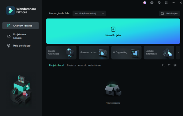 Na janela inicial do Wondershare Filmora, você verá uma série de opções, mas a que procuramos está sob o nome de “novo projeto”. Clique no botão azul e então uma nova janela abrirá. Aqui você verá a linha do tempo, onde as edições são realizadas, incluindo a tarefa de transcrição de áudios em textos.